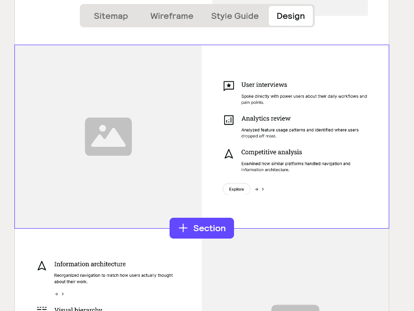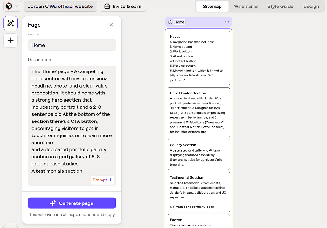 Exploring AI with Relume - by feeding my wireframe outlines into prompts, quickly generate initial sitemaps, wireframes, and style guides — a process that would normally take hours condensed into minutes. Relume AI helped me to: