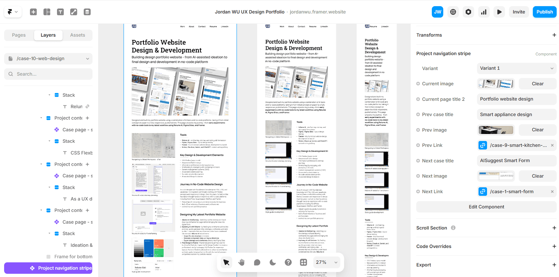 Final Design in Framer - Framer became my primary tool for building the final site. It gave me full design freedom to create a professional, site by leveraging CSS flexbox for responsive layouts. Framer's flexibility allowed me to utilize my wireframes and style guide, bringing them to life with the level of precision and professionalism my portfolio needed.