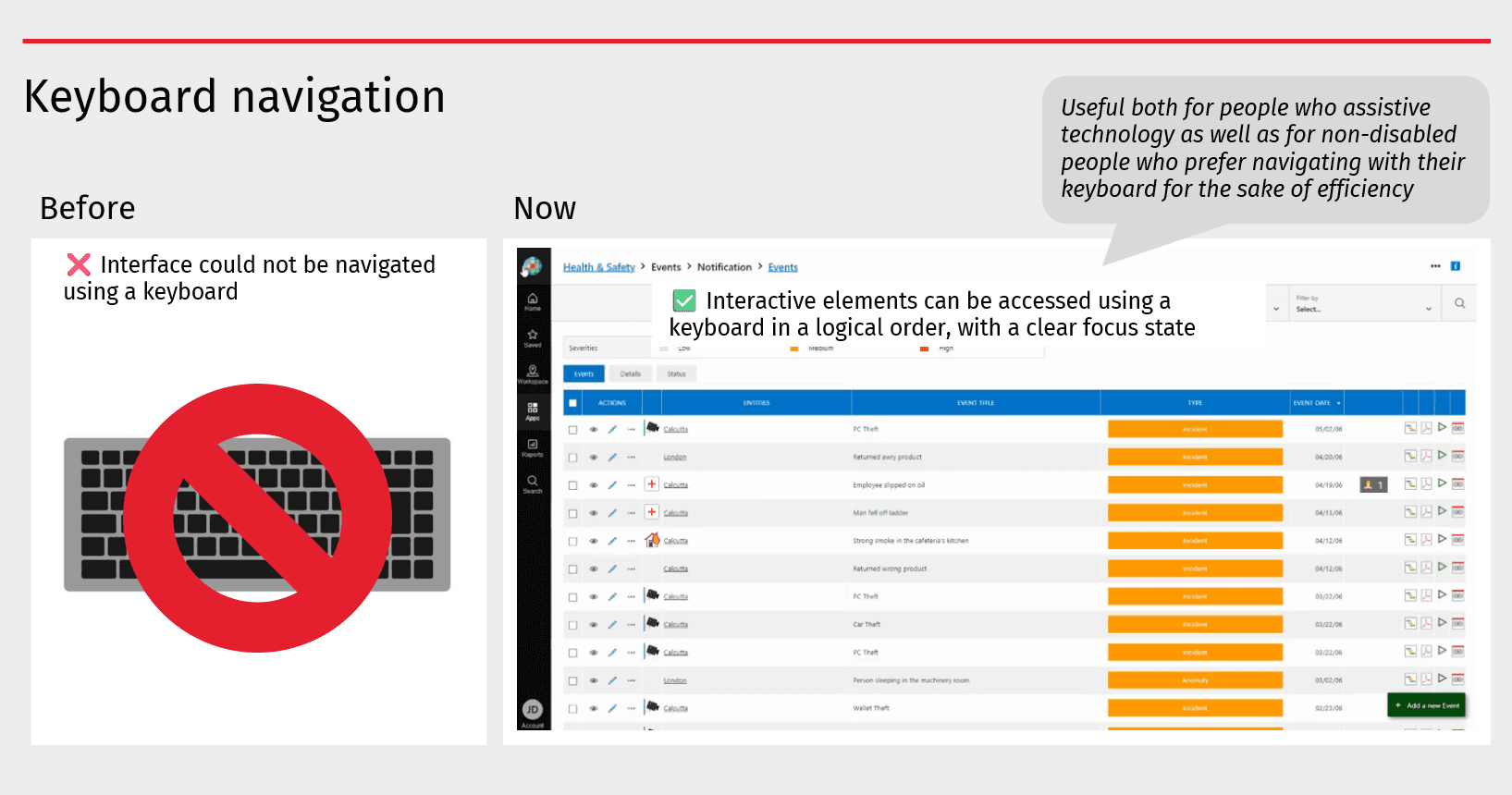 These improvements created predictable, navigable experiences for users relying on assistive technologies, ensuring that all interactive elements were discoverable and operable without a mouse.