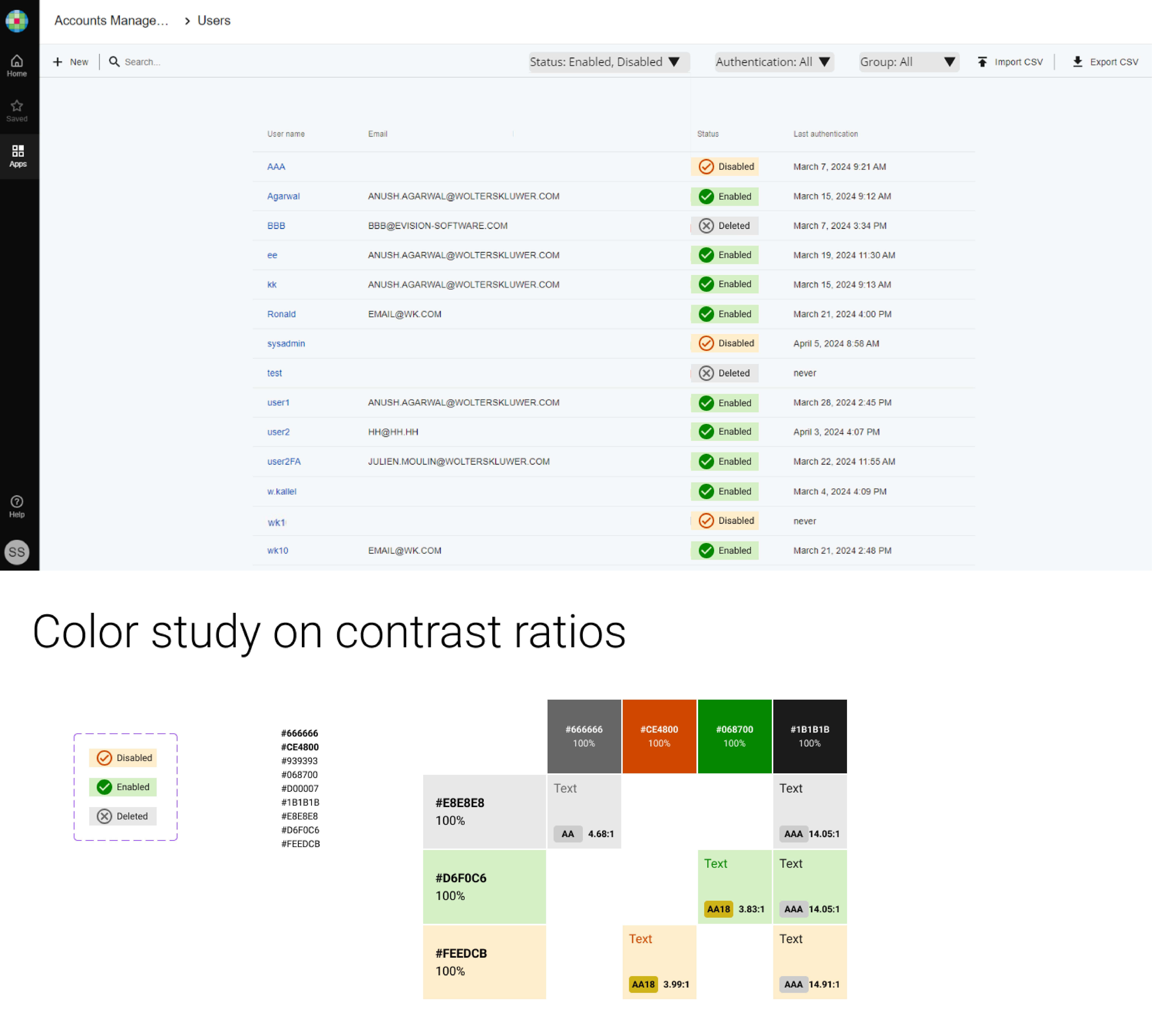 Use accessible colors for icons and labels of Disable, Enabled and Deleted statuses against colored bands - conforming to WCAG SC 1.4.11 “Required for understanding”, and SC 1.1.1 “Non-text content, pure decoration”