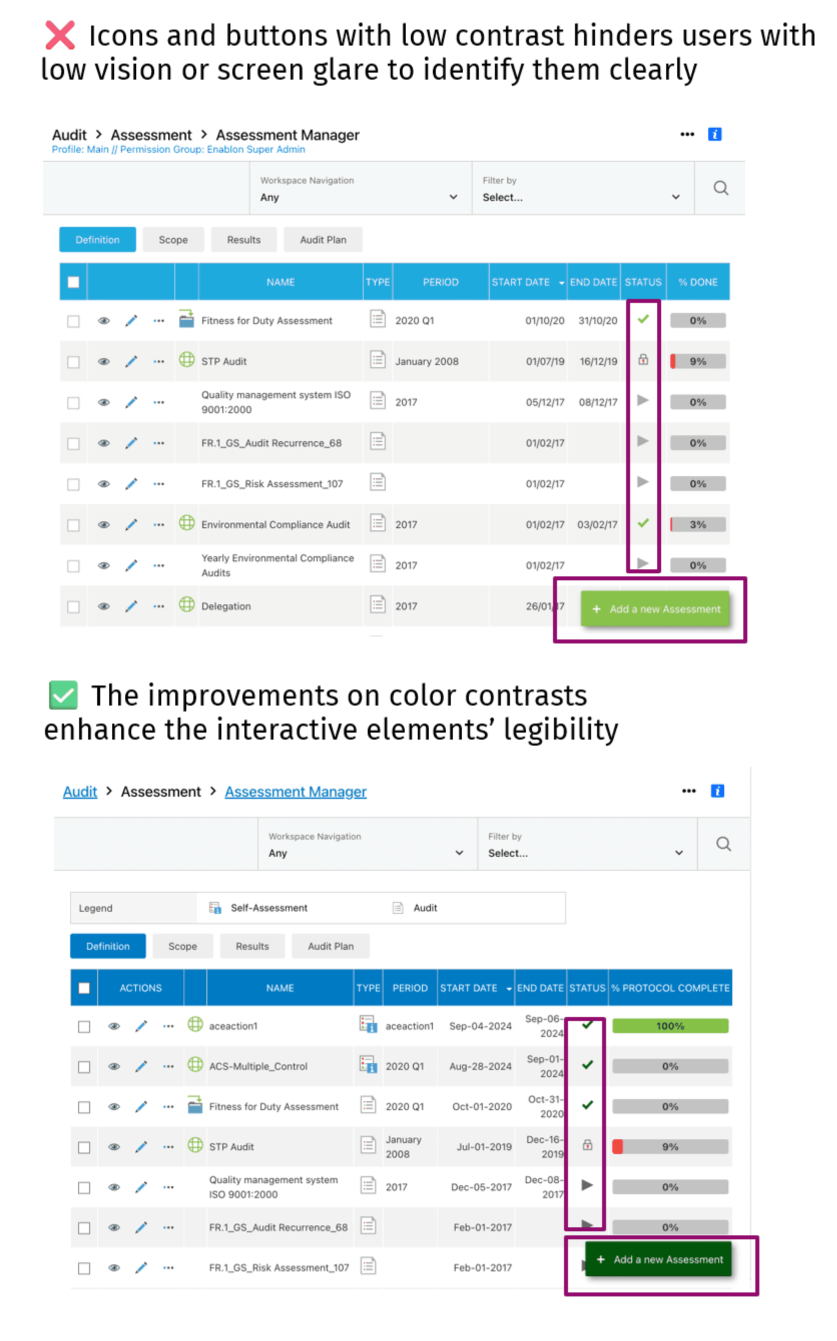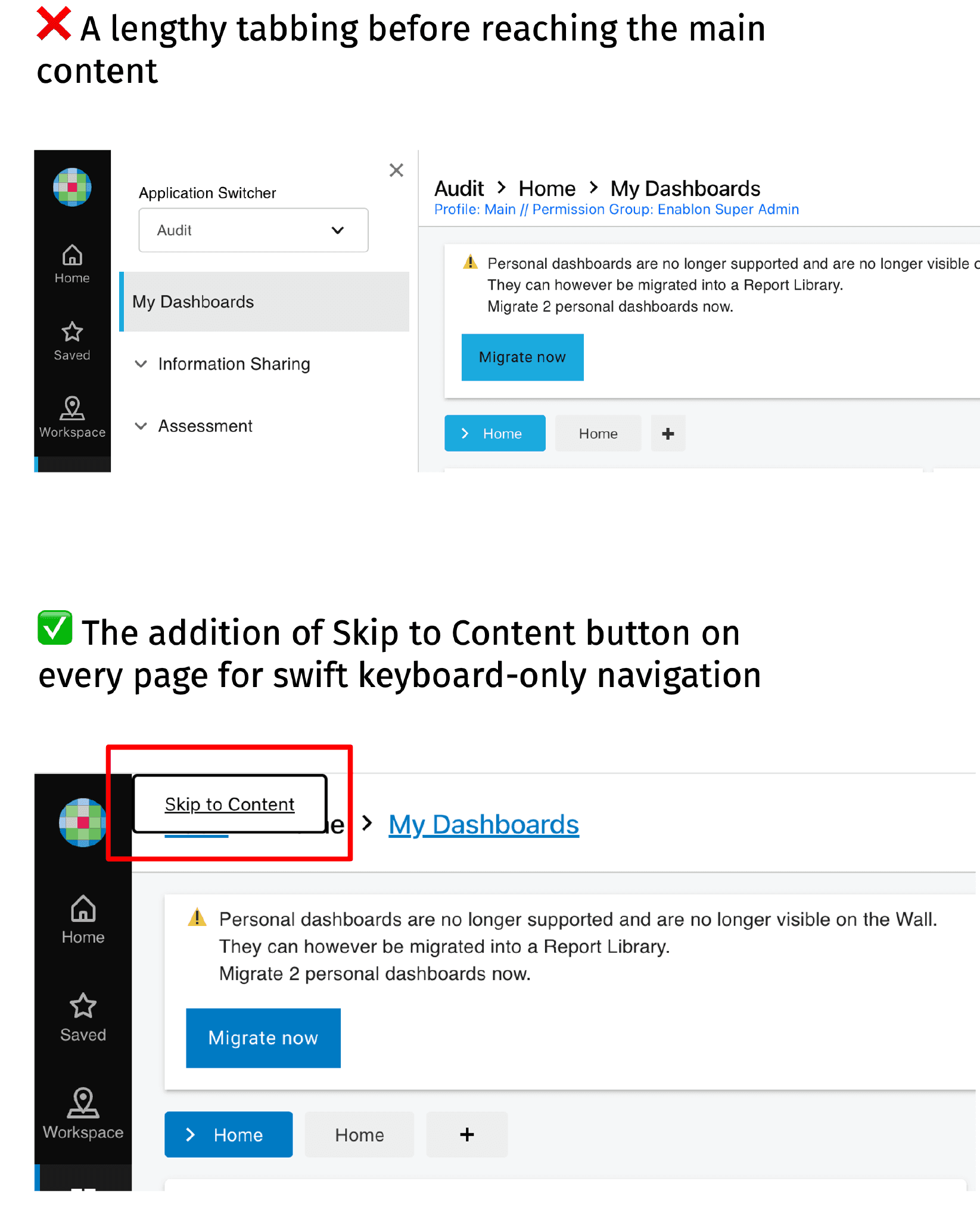 I led accessibility audits across Enablon products, conducting thorough evaluations against WCAG 2.2 success criteria to identify and document barriers to access. I identified critical issues spanning: