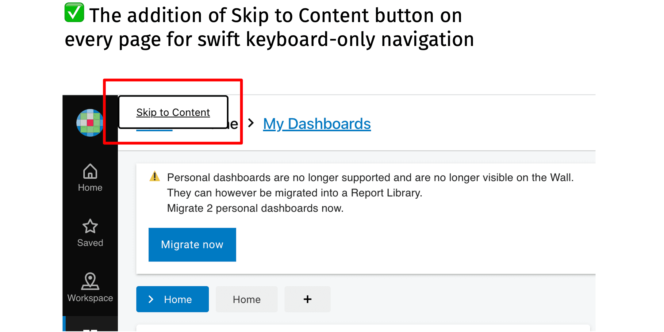 Navigation: Refined focus management and tab orders to enable efficient, predictable keyboard-only use.